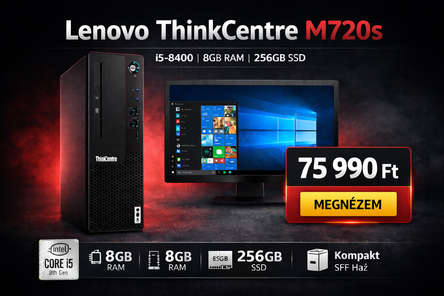 A Lenovo ThinkCentre M720s egy üzleti kategóriás, megbízható asztali számítógép, amely kiváló választás irodai, vállalati és otthoni munkakörnyezetbe egyaránt. A 6 magos Intel Core i5 processzor és az SSD meghajtó gyors, stabil működést biztosít még több feladat egyidejű futtatása mellett is.