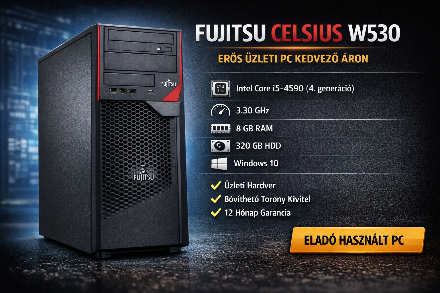 A Fujitsu CELSIUS W530 egy megbízható, munkaállomás kategóriás torony számítógép, amely ideális választás irodai feladatokra, tanuláshoz vagy általános otthoni használatra. A 4. generációs Intel Core i5 processzor stabil teljesítményt biztosít mindennapi alkalmazásokhoz, míg a masszív torony kialakítás lehetővé teszi a későbbi bővítést.