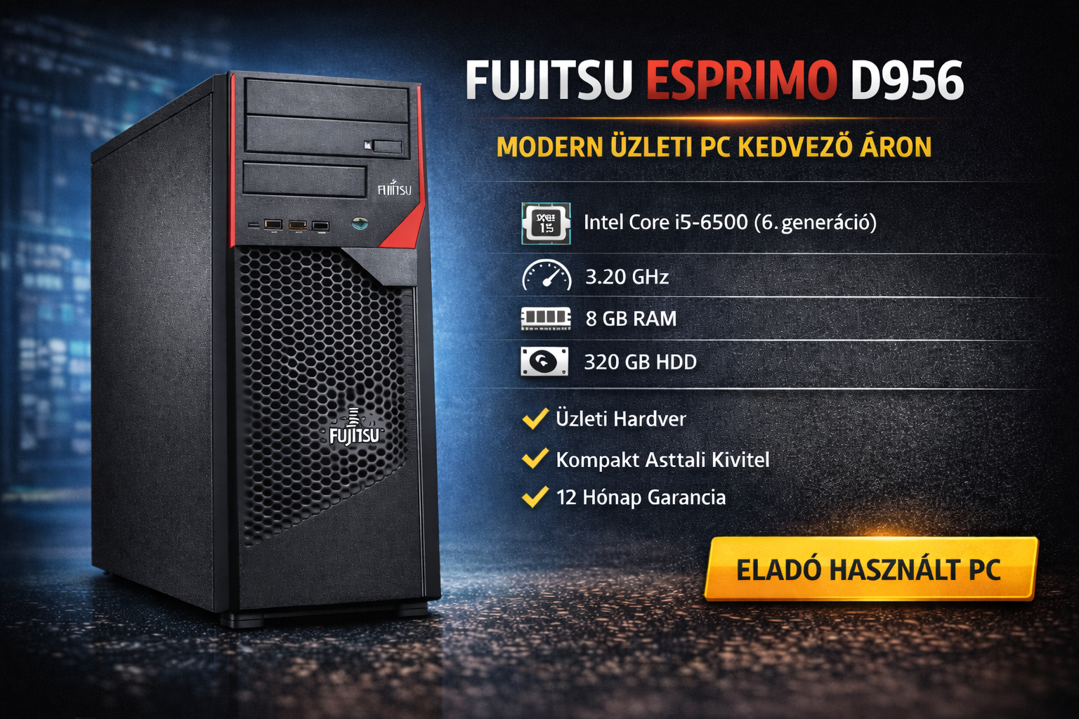 A Fujitsu ESPRIMO D956 egy megbízható, üzleti kategóriás asztali számítógép, amely már 6. generációs Intel Core i5 processzorral érkezik, így gyorsabb és energiatakarékosabb működést biztosít a korábbi modellekhez képest. Ideális választás irodai munkához, tanuláshoz vagy általános otthoni felhasználásra.